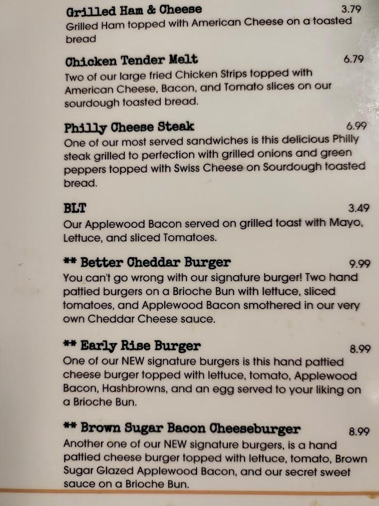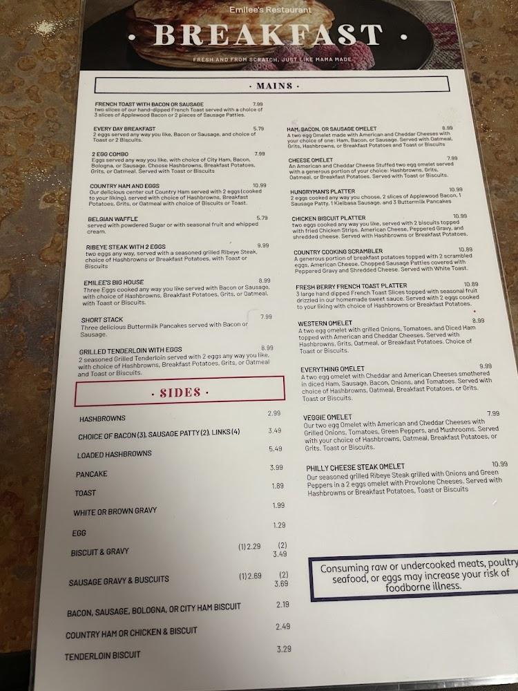 Emilee's menu features a delicious array of homestyle dishes. Breakfast shines with options like the Hungryman's Platter and French Toast. Lunch and dinner plates include favorites such as chicken fried steak and fried fish, with lots of sides to choose from. Desserts like chocolate cake stand out, finishing meals perfectly. The variety ensures there's something for everyone, including kids.